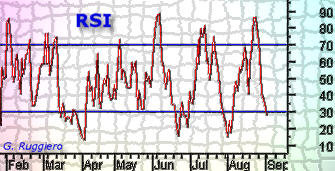 La prima: RSI= 100-100/(1+RR) dove RR è uguale al numero dei giorni di rialzo/numero